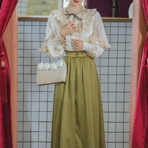 교복몰 소프트 레이스 긴팔 블라우스_그린 트임 롱스